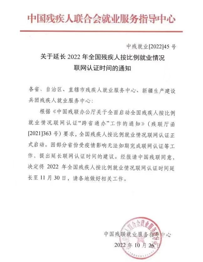 關於延長2022年全國殘疾人按比例就業情況