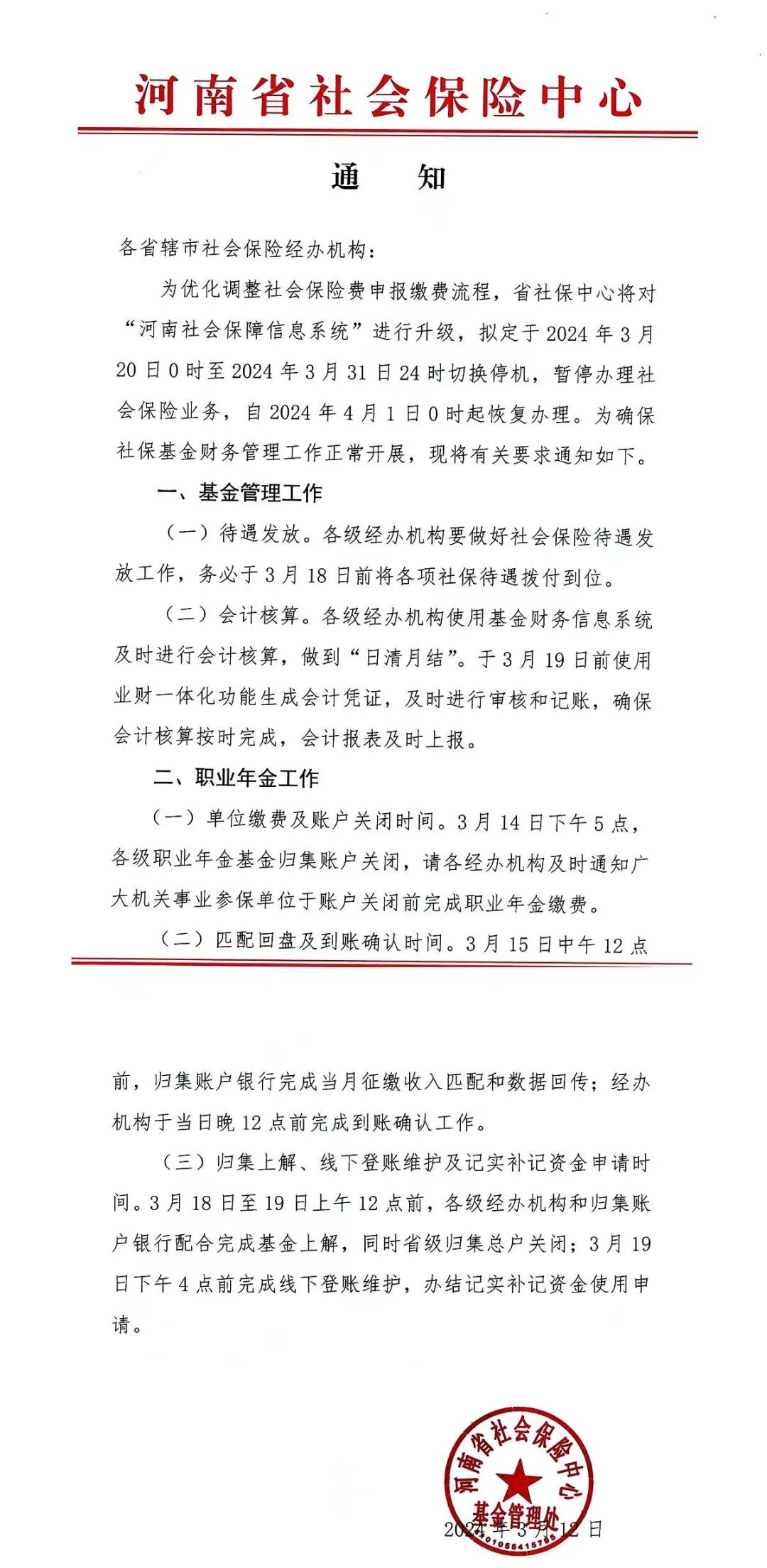 最新,省社保中心将對“河南社會保障信息系統”進行升級,拟定於(yú)2024年3月20日0時至2024年3月31日24時切換停機,暫停辦(bàn)理社會保險業務,自4月1日起恢複辦(bàn)理!