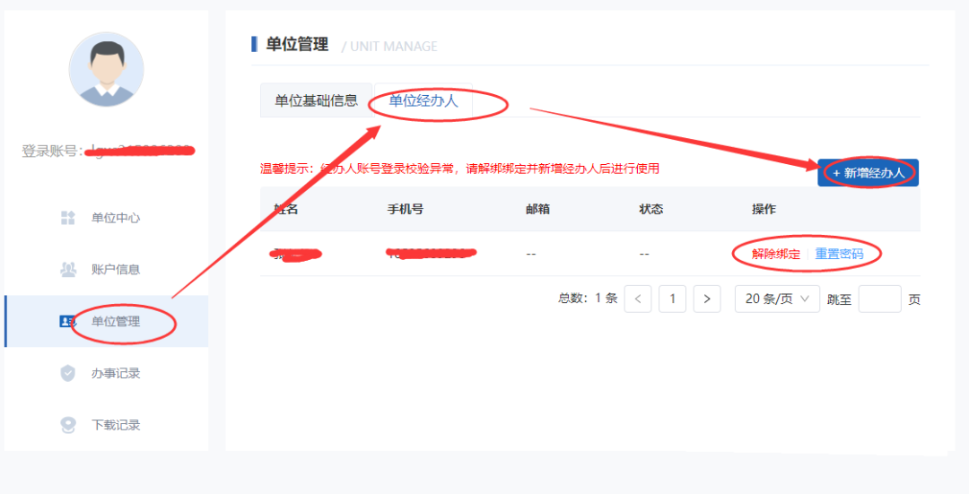 答:如果沒有或者忘記經辦(bàn)人賬号,可以通過醫療服務平台單(dān)位賬号登錄,在“單(dān)位管理”——“單(dān)位經辦(bàn)人”——“新增經辦(bàn)人”