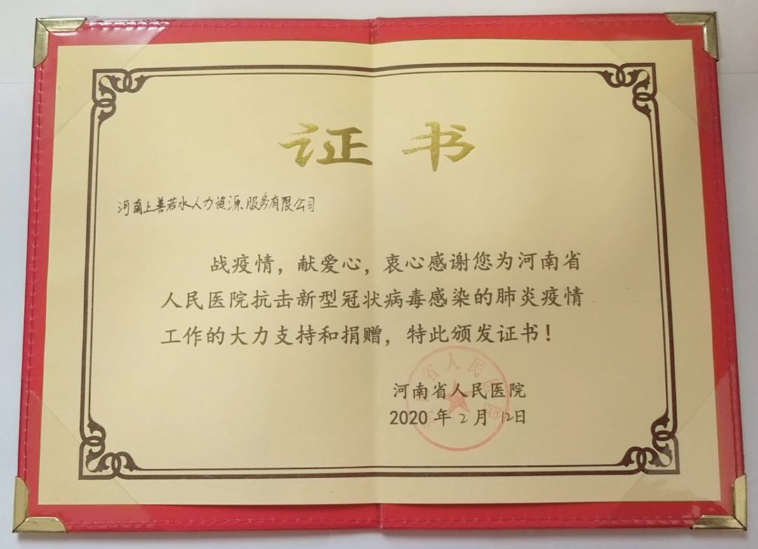 2020年2月12日,在舉國上下抗擊疫情的非常時刻,在醫療物資嚴重短缺的情況下,河南上善若水人力資源有限公司向河南省人民醫院、武漢(hàn)紅(hóng)十字會捐款捐物,回饋社會,奉獻愛心。